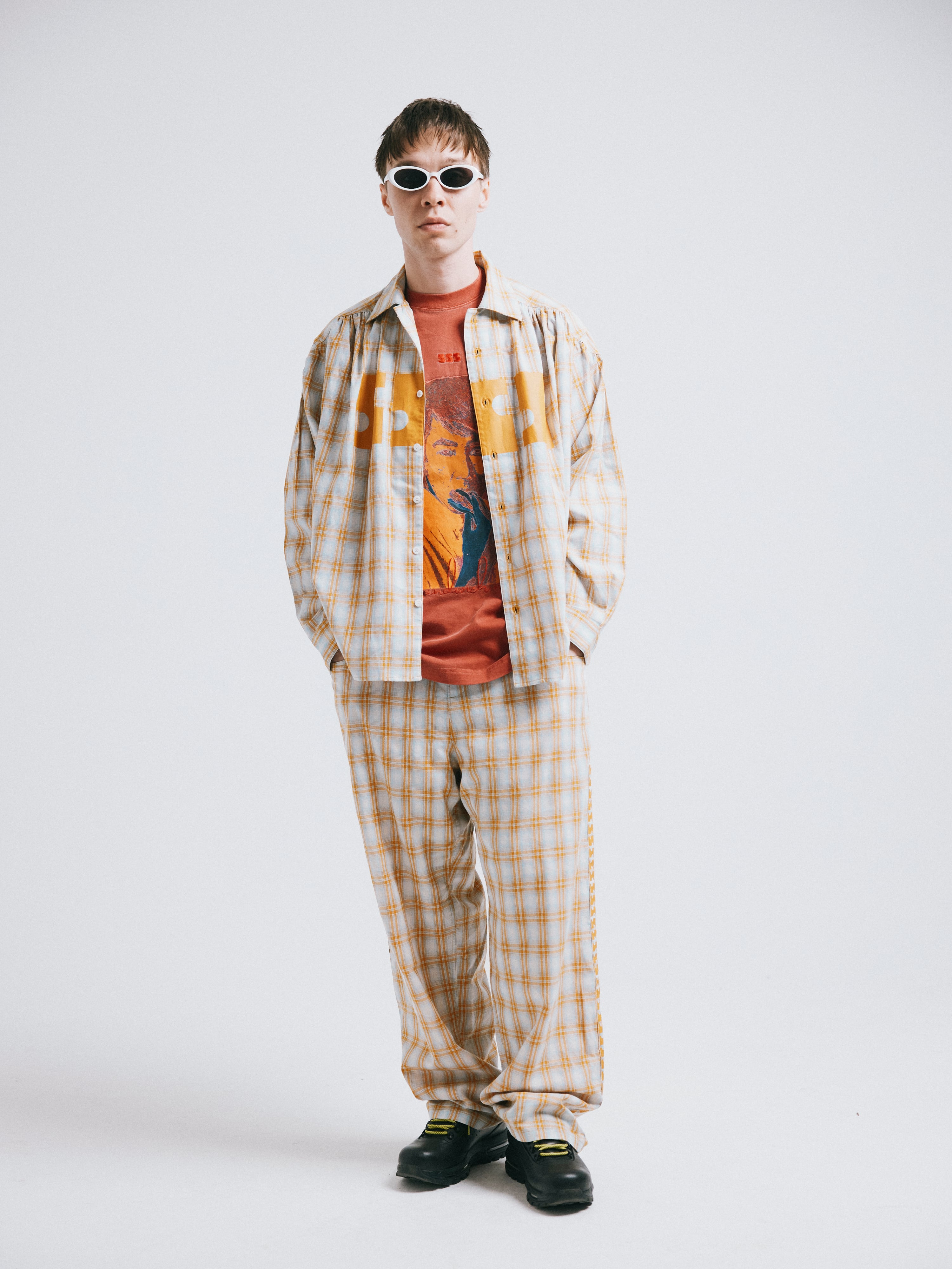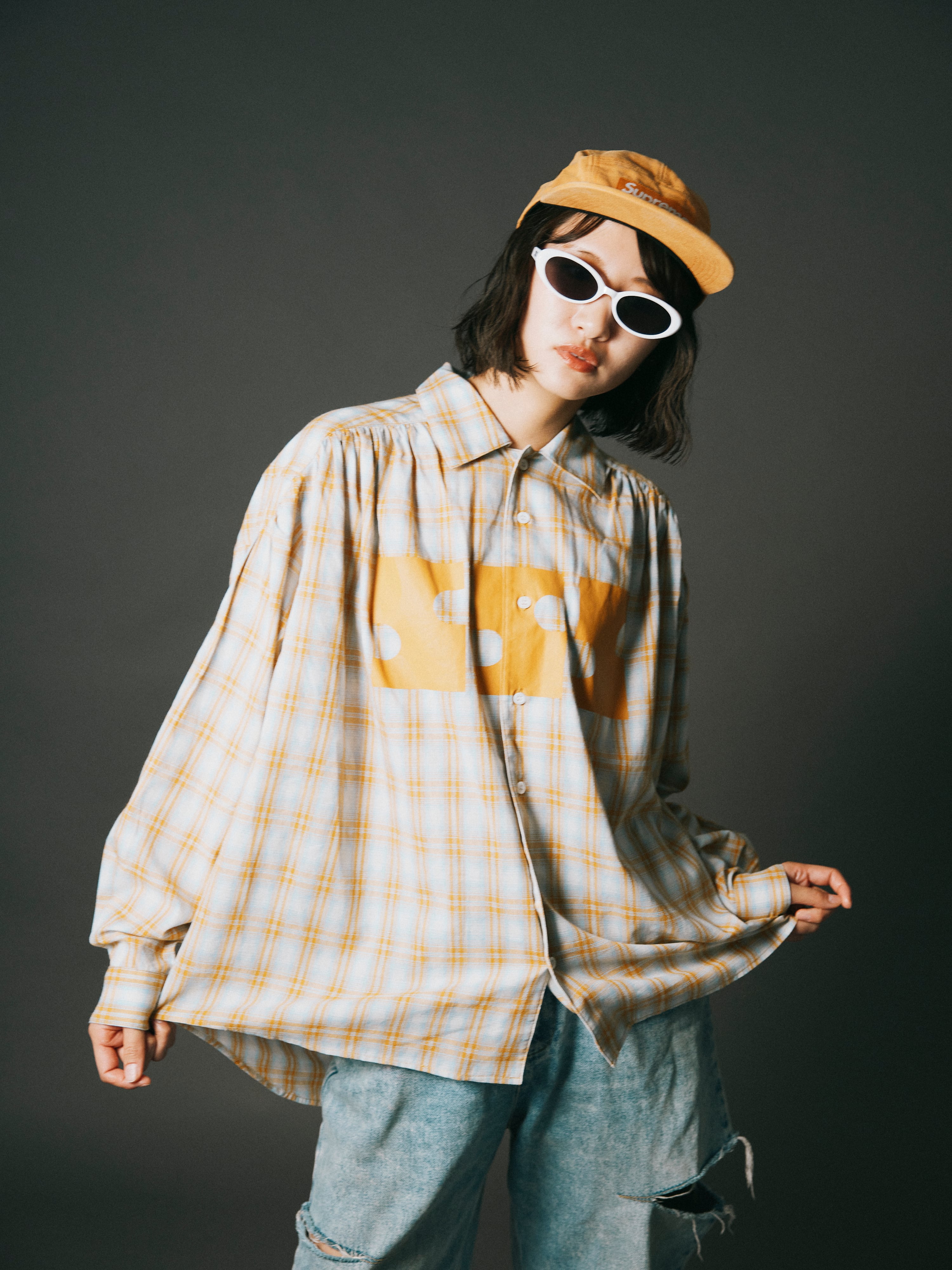 クラシックなチェックに、現代的なストリートバランスを加えています。